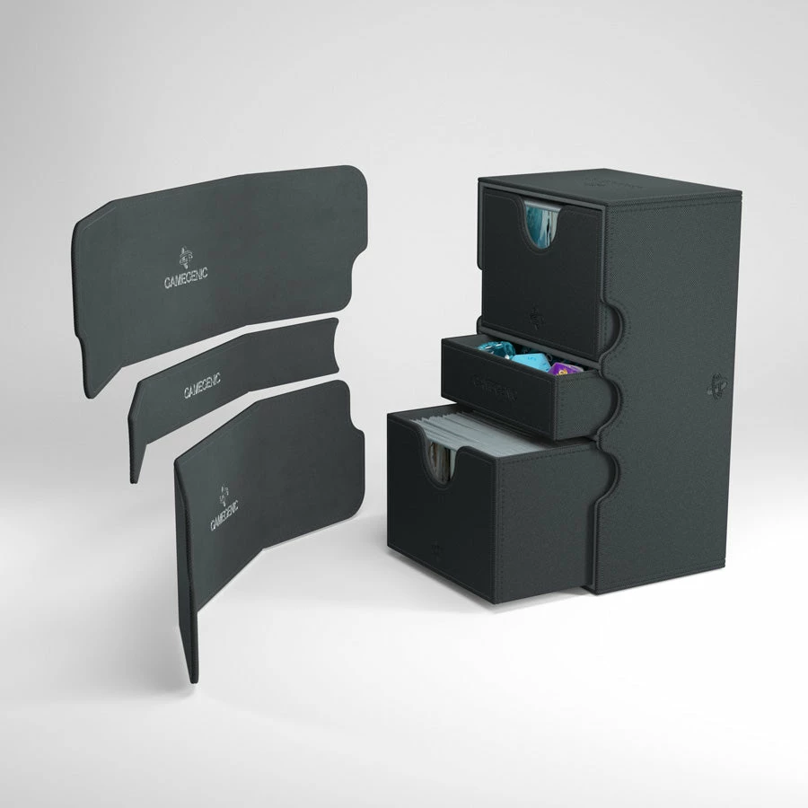 Two removable card holders keep up to 200 double-sleeved cards in this large and extremely robust deck box. The Stronghold is covered with elegant Nexofyber material, with soft microfiber inside, and also contains an accessories drawer. Just like other Convertible products, its flaps are removable and can be clipped to the back side of the box. Powerful magnets ensure a safe closure. Completely removable, interchangeable flaps and inner card holders offer Mix & Match customization options.