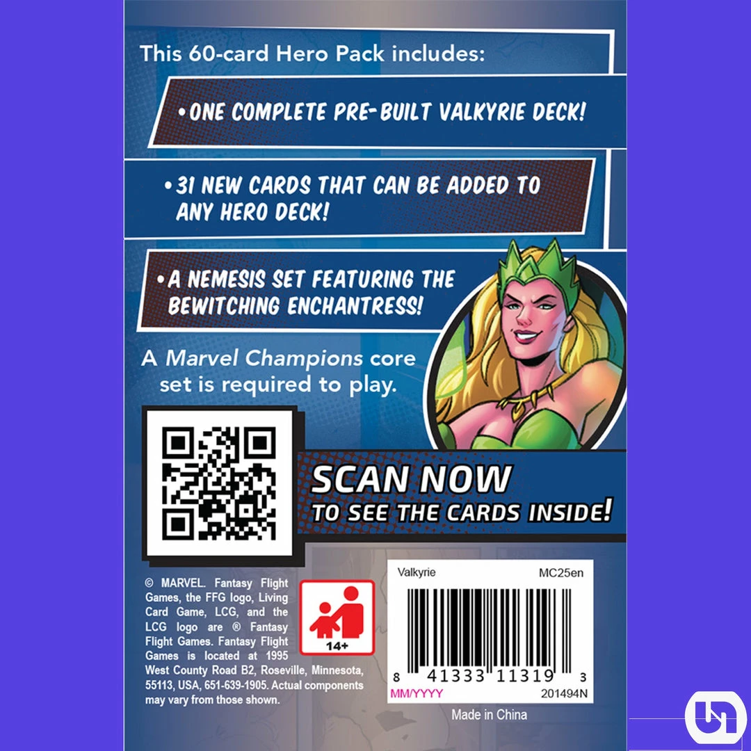 Appointed leader of the legendary Valkyrior by Odin, Brunnhilde defied the All-Fatherβs wishes by leaving Asgard to join the Avengers. Since that day, she has dedicated herself to the defense of Midgard as the valiant Valkyrieβand sheβs flying into playersβ games of Marvel Champions: The Card Game. By choosing a foe with the menacing Death-Glow, Valkyrie can mark her foes for death. Within this Hero Pack, players will find Valkyrie, her sixteen signature cards, and a full assortment of Aggression cards inviting players to smash the villain head-on.