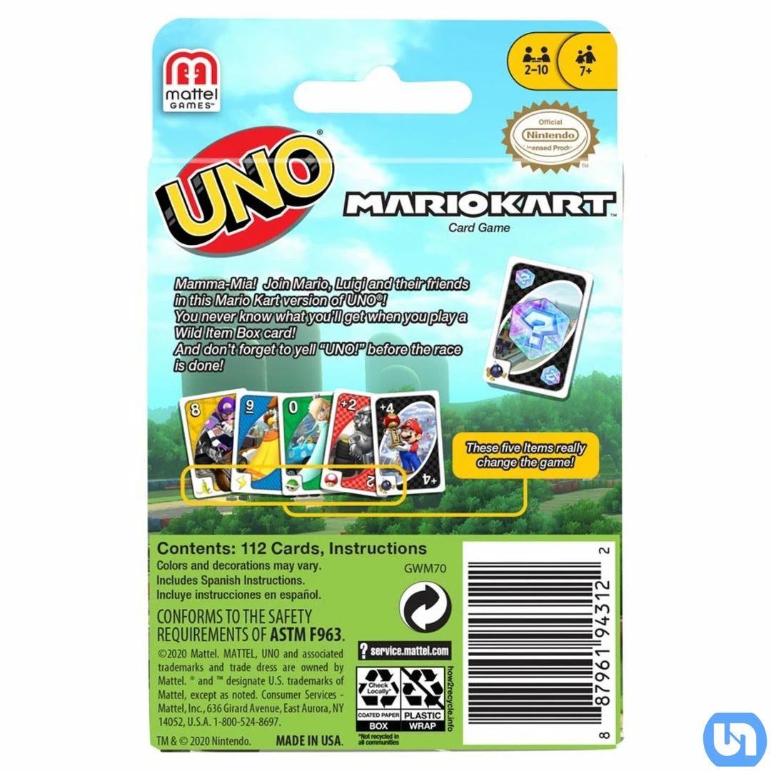 The UNOยฎ matching card game everyone loves rides into the Mario Kart world of crazy obstacles and racing go-karts! Graphics from the game on every card make this unique pack a collectible for fans. It plays like classic UNOยฎ, except every card has anย itemย icon in the corner (Mushroom, Banana Peel, Green Shell, Lightning, or Bomb).