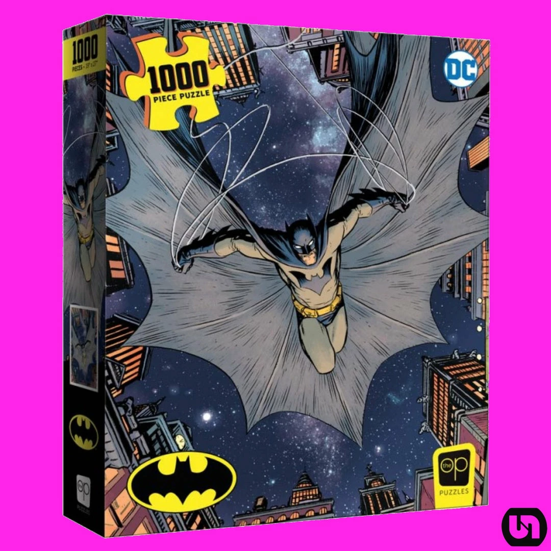 A fierce and unfurled Batman descends from Gotham City heights in this 1,000-piece jigsaw puzzle featuring a retro comic-style Caped Crusader centered amidst towers and a starry sky.